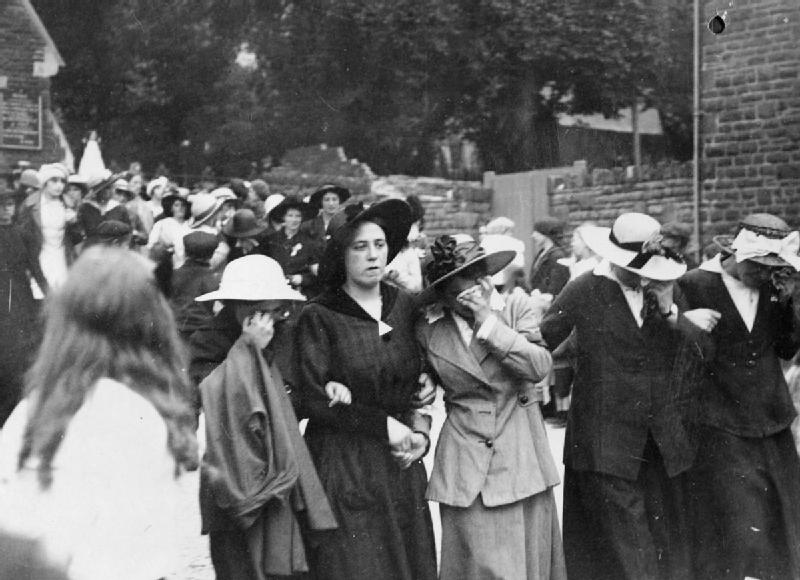 Featured image: Female munition workers crying at the funeral of a colleague killed by an accident at work in Swansea in August 1917; Wikimedia Commons.